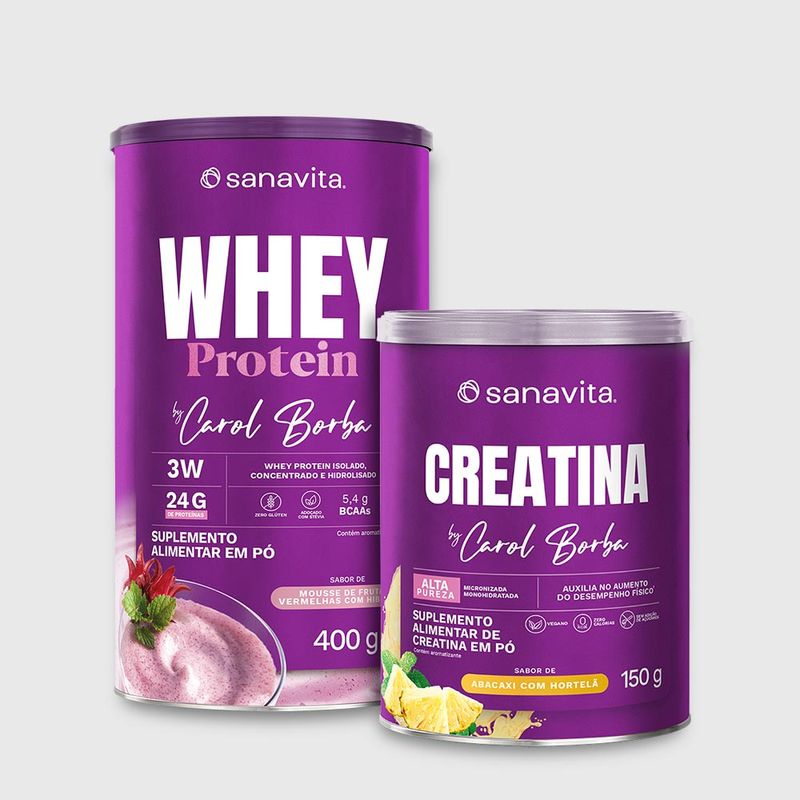 Como podemos te ajudar?O Combo #PartiuVerão é composto por: 1 Whey Protein - Mousse de Frutas Vermelhas 1 Creatina - Abacaxi com Hortelã Descrição Whey Protein O Whey Protein by Carol Borba foi desenvolvido em parceria com a educadora física e a maior youtuber fitness feminina da América Latina, Carol Borba, e a equipe de especialistas da Sanavita. Esta fórmula exclusiva combina três tipos de whey protein – isolado, concentrado e hidrolisado, oferecendo um alto teor de proteínas para atender as necessidades de quem precisa cuidar dos músculos. Fonte natural de aminoácidos essenciais, como os BCAAs (leucina, isoleucina e valina), o Whey Protein by Carol Borba é ideal para praticantes de atividade física que buscam fontes de proteína de alta qualidade para auxiliar no fortalecimento da massa muscular e nos resultados dos treinos. Além disso, a suplementação com esse whey pode contribuir para o aumento da ingestão diária de proteínas, fundamental para quem tem uma rotina ativa, passou dos 50 anos ou busca desempenho físico. O Whey Protein Carol Borba também ajuda na formação de ossos fortes e saudáveis, o que é essencial para manter a saúde e a vitalidade em qualquer fase da vida. Descrição Creatina A Creatina da Carol Borba é um suplemento desenvolvido em colaboração com a educadora física e maior youtuber fitness feminina da América Latina, Carol Borba. Junto com o time de especialistas da Sanavita, ela participou de todo o processo de criação, desde a concepção da fórmula até a escolha dos deliciosos sabores, como abacaxi com hortelã e tangerina splash, tornando a experiência de tomar creatina com sabor mais agradável e fácil. Formulada com creatina monohidratada de altíssima pureza e micronizada, a Creatina da Carol Borba oferece excelente absorção e eficácia. A creatina é fundamental para fornecer energia rápida às células musculares, sendo especialmente eficaz em exercícios de alta intensidade e curta duração, como musculação, crossfit e treinamento funcional. A suplementação de creatina é segura, sendo uma das substâncias mais estudadas e recomendadas no campo da nutrição esportiva e da fisiologia do exercício, para auxiliar no aumento do desempenho físico. Seu uso contínuo, pode ser também interessante em fases da vida com maiores demandas musculares, como na pré e pós-menopausa, ou após os 50 anos, ajudando no bem-estar e a na funcionalidade geral dos músculos. A Creatina da Carol Borba é livre de ingredientes de origem animal, sendo uma opção segura e eficaz para vegetarianos e veganos.