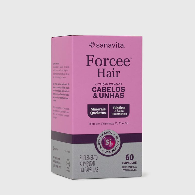 Como podemos te ajudar?Forcee® Hair é um suplemento para cabelos avançado desenvolvido para nutrir e fortalecer cabelos e unhas, com uma fórmula que supre as principais deficiências nutricionais associadas ao enfraquecimento e queda dos fios. Cada cápsula oferece uma fórmula concentrada que inclui: • Silício orgânico estabilizado em colina, conhecido por sua alta biodisponibilidade e comprovada eficácia clínica. • Combinação de minerais quelatos, como ferro, zinco, selênio e cobre, que garante uma absorção eficiente. • Biotina, ácido pantotênico, e vitaminas B1 e B6, essenciais para a saúde dos cabelos e unhas • Vitamina C, potente antioxidante que auxilia na formação de colágeno.
