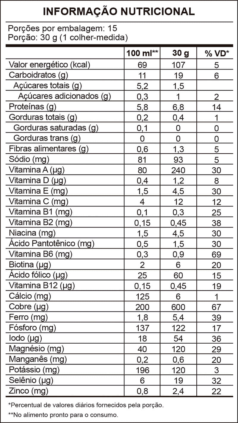 | INGREDIENTES: maltodextrina, proteína isolada de soja, polpa de morango desidratada em pó, proteína concentrada do soro do leite, polidextrose, polpa de blueberry e beterraba desidratadas em pó, cloreto de potássio anidro (potássio), carbonato de magnésio (magnésio), ácido ascórbico (vitamina C), niacinamida (niacina), pirofosfato férrico (ferro), DL-alfa-acetato de tocoferol (vitamina E), sulfato de zinco monohidratado (zinco), pantotenato de cálcio (ácido pantotênico), cloridrato de piridoxina (vitamina B6), sulfato de cobre anidro (cobre), sulfato de manganês monohidratado (manganês), riboflavina (vitamina B2), mononitrato de tiamina (vitamina B1), palmitato de retinol (vitamina A), ácido pteroilmonoglutâmico (ácido fólico), iodeto de potássio (iodo), selênio, biotina, colecalciferol (vitamina D), cianocobalamina (vitamina B12), aroma idêntico ao natural, espessante goma xantana e edulcorante sucralose. NÃO CONTÉM GLÚTEN. CONTÉM LACTOSE. ALÉRGICOS: CONTÉM DERIVADOS DE LEITE E DE SOJA. | |||